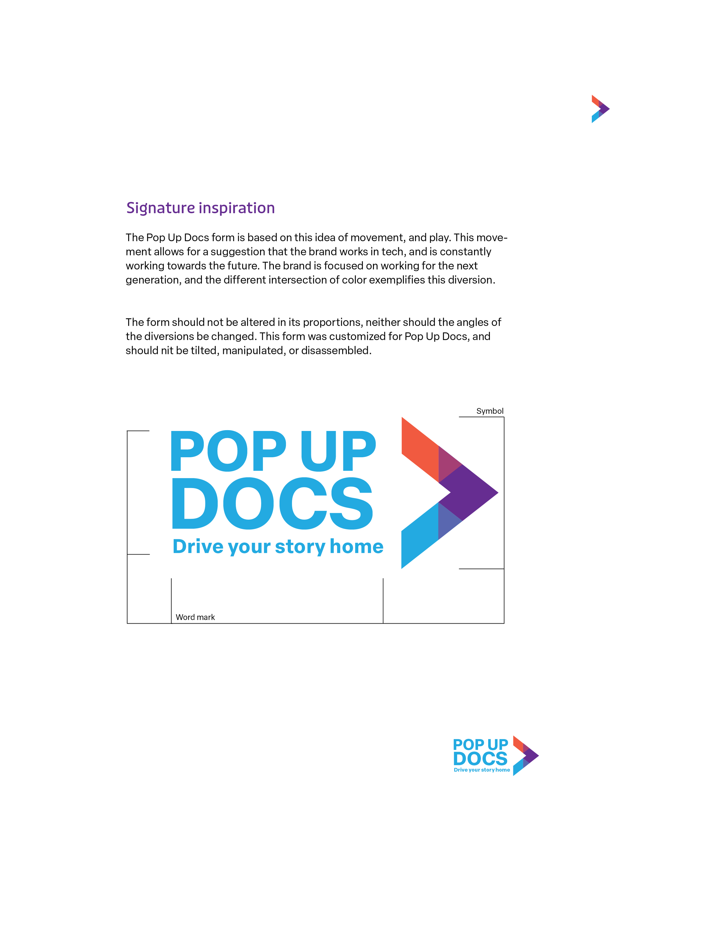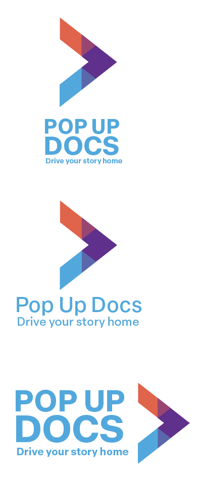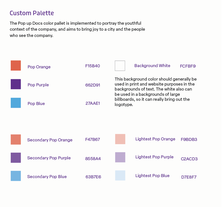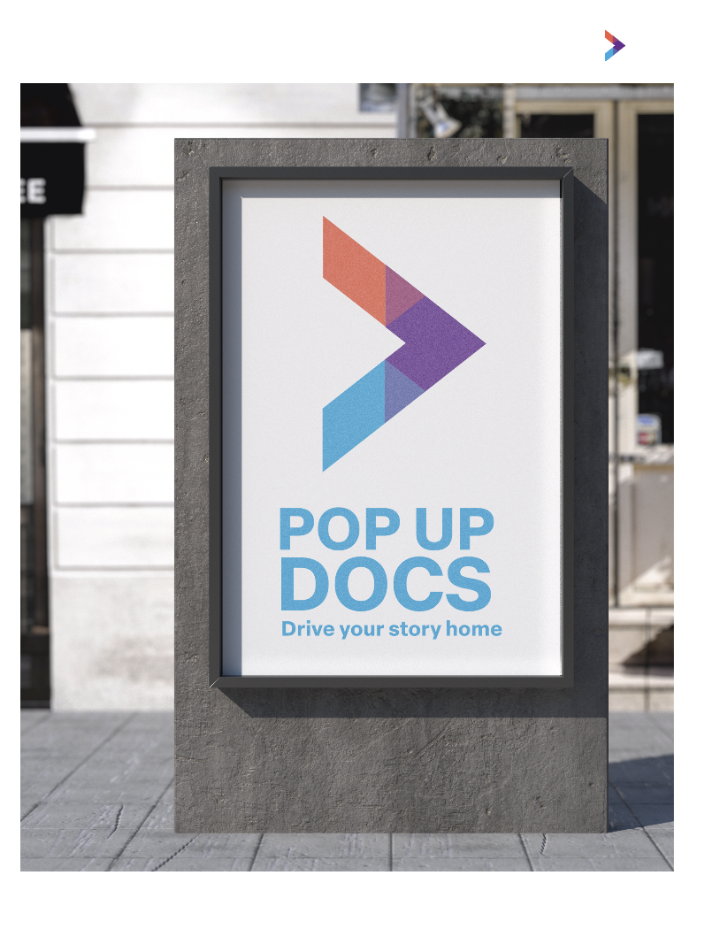 Throughout the process of this design I was inspired a lot by bold typography, street signs, and things one may find in the city. With this company being focused on inclusivity in film making I felt that it was only right to find some way to intersect different colors representing different groups of people. That is where I came up with this play symbol and imagery, continuing to move to new dimensions in learning. As for the color palette, I was looking to invite the viewer to the playful company that is PopUpDocs. Our colors reflect our open relationship with people, and how we have open arms with all.